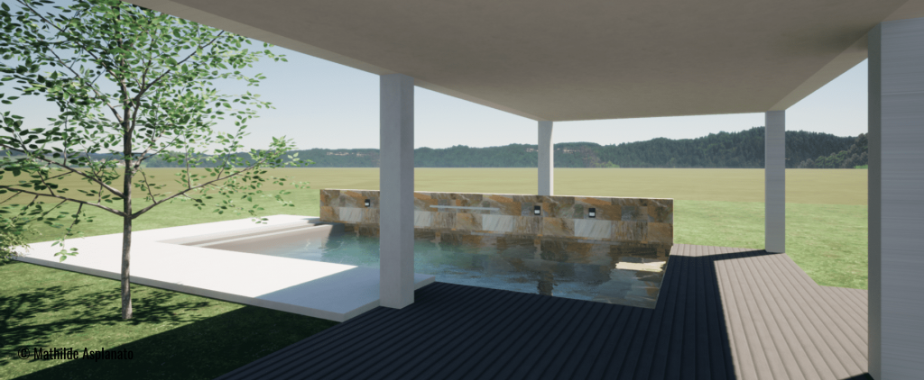 Une fenêtre panoramique dans la salle de bain permet de concevoir un espace intérieur fermé qui donne, à travers une vitre, sur l’espace intermédiaire, où le concept de nature est théâtralisé, ça deviendra alors une mise en scène dont la nature sera le thème majeur.